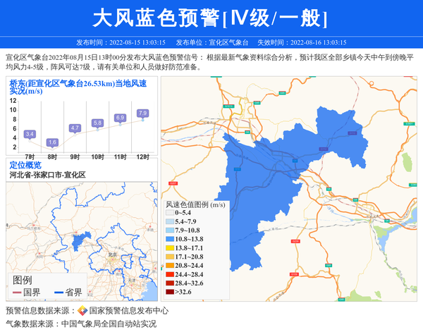 宣化区气象台2022年08月15日13时00分发布大风蓝色预警信号:根据最新气象资料综合分析,预计我区全部乡镇今天中午到傍晚平均风力4-5级,阵风可达7级,请有关单位和人员做好防范准备。 信息来源:国家预警信息发布中心; 发布单位:宣化区气象台。