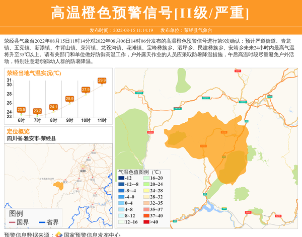 荥经县气象台2022年08月15日11时14分对2022年08月06日14时06分发布的高温橙色预警信号进行第9次确认:预计严道街道、青龙镇、五宪镇、新添镇、牛背山镇、荥河镇、龙苍沟镇、花滩镇、宝峰彝族乡、泗坪乡、民建彝族乡、安靖乡未来24小时内最高气温将升至35℃以上。请有关部门和单位做好防御高温工作,户外露天作业的人员应采取防暑降温措施,午后高温时段尽量避免户外活动,特别注意老弱病幼人群的防暑降温。 信息来源:国家预警信息发布中心; 发布单位:荥经县气象台。