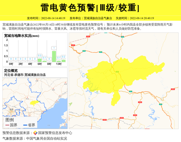 宽城满族自治县气象台2022年08月14日14时38分继续发布雷电黄色预警信号:预计未来6小时内我县全部乡镇将受雷阵雨天气影响,雷雨时局地可能伴有短时强降水、雷暴大风、冰雹等强对流天气,请有关单位和人员做好防范准备。 信息来源:国家预警信息发布中心; 发布单位:宽城满族自治县气象台。