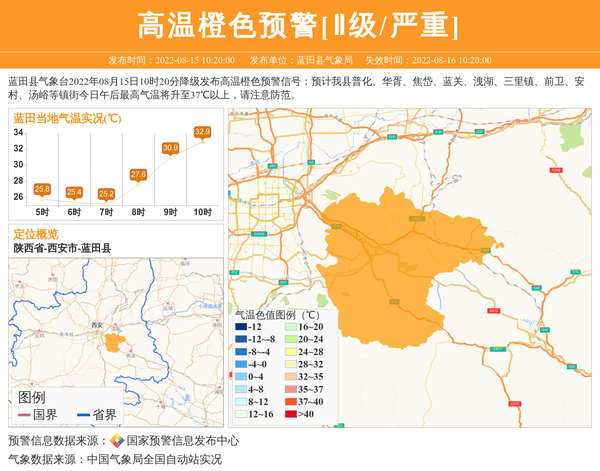 蓝田县气象台2022年08月15日10时20分降级发布高温橙色预警信号:预计我县普化、华胥、焦岱、蓝关、洩湖、三里镇、前卫、安村、汤峪等镇街今日午后最高气温将升至37℃以上,请注意防范。 信息来源:国家预警信息发布中心; 发布单位:蓝田县气象局。