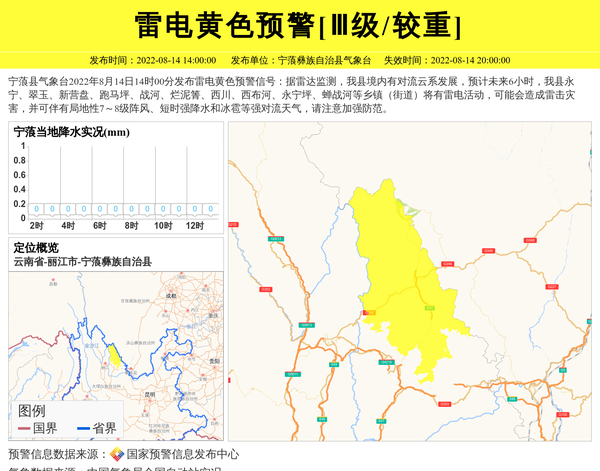 宁蒗县气象台2022年8月14日14时00分发布雷电黄色预警信号:据雷达监测,我县境内有对流云系发展,预计未来6小时,我县永宁、翠玉、新营盘、跑马坪、战河、烂泥箐、西川、西布河、永宁坪、蝉战河等乡镇(街道)将有雷电活动,可能会造成雷击灾害,并可伴有局地性7~8级阵风、短时强降水和冰雹等强对流天气,请注意加强防范。 信息来源:国家预警信息发布中心; 发布单位:宁蒗彝族自治县气象台。