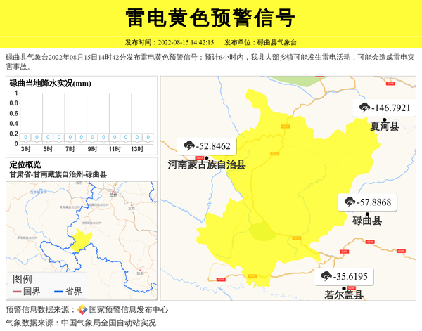 碌曲县气象台2022年08月15日14时42分发布雷电黄色预警信号:预计6小时内,我县大部乡镇可能发生雷电活动,可能会造成雷电灾害事故。 信息来源:国家预警信息发布中心; 发布单位:碌曲县气象台。