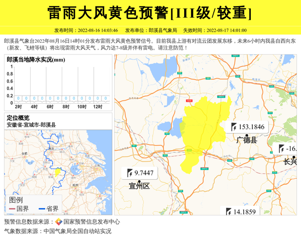 郎溪县气象台2022年08月16日14时01分发布雷雨大风黄色预警信号。目前我县上游有对流云团发展东移,未来6小时内我县自西向东(新发、飞鲤等镇)将出现雷雨大风天气,风力达7-8级并伴有雷电。请注意防范! 信息来源:国家预警信息发布中心; 发布单位:郎溪县气象局。