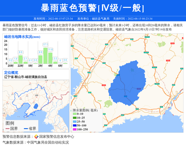 暴雨蓝色预警信号:过去11小时,岫岩县红旗营子乡的降水量已达到45毫米;预计未来1小时,还将出现10到20毫米的降水,请相关部门做好防暴雨准备工作,做好城区和农田排涝准备,注意道路积水和交通阻塞。岫岩县气象台2022年8月15日7时19分发布 信息来源:国家预警信息发布中心; 发布单位:岫岩县气象局。