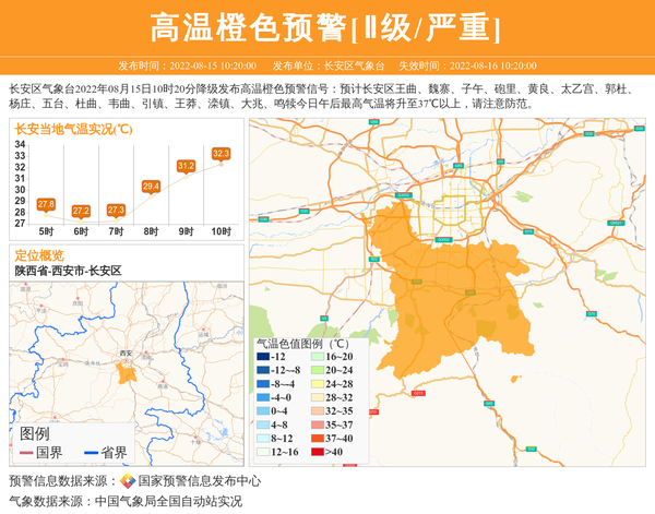 长安区气象台2022年08月15日10时20分降级发布高温橙色预警信号:预计长安区王曲、魏寨、子午、砲里、黄良、太乙宫、郭杜、杨庄、五台、杜曲、韦曲、引镇、王莽、滦镇、大兆、鸣犊今日午后最高气温将升至37℃以上,请注意防范。 信息来源:国家预警信息发布中心; 发布单位:长安区气象台。