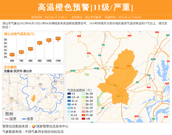 潜山市气象台2022年08月15日12时06分继续发布高温橙色预警信号。24小时内我市大部分地区最高气温仍将达到37℃以上。请注意防范! 信息来源:国家预警信息发布中心; 发布单位:潜山市气象局。