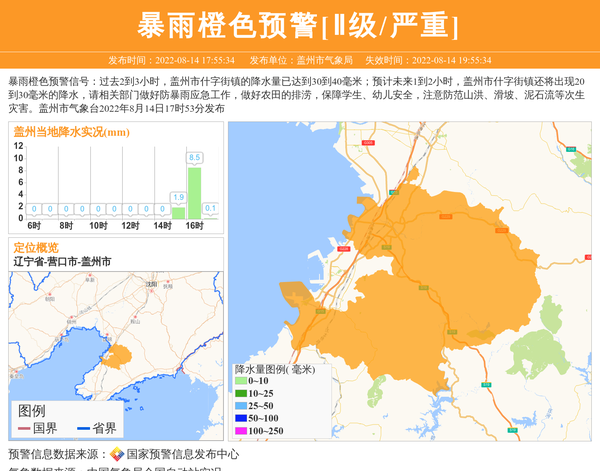 暴雨橙色预警信号:过去2到3小时,盖州市什字街镇的降水量已达到30到40毫米;预计未来1到2小时,盖州市什字街镇还将出现20到30毫米的降水,请相关部门做好防暴雨应急工作,做好农田的排涝,保障学生、幼儿安全,注意防范山洪、滑坡、泥石流等次生灾害。盖州市气象台2022年8月14日17时53分发布 信息来源:国家预警信息发布中心; 发布单位:盖州市气象局。
