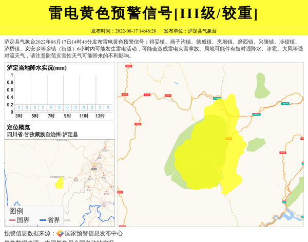 泸定县气象台2022年08月17日14时48分发布雷电黄色预警信号:得妥镇、燕子沟镇、德威镇、烹坝镇、磨西镇、兴隆镇、冷碛镇、泸桥镇、岚安乡等乡镇(街道)6小时内可能发生雷电活动,可能会造成雷电灾害事故。局地可能伴有短时强降水、冰雹、大风等强对流天气,请注意防范灾害性天气可能带来的不利影响。 信息来源:国家预警信息发布中心; 发布单位:泸定县气象台。