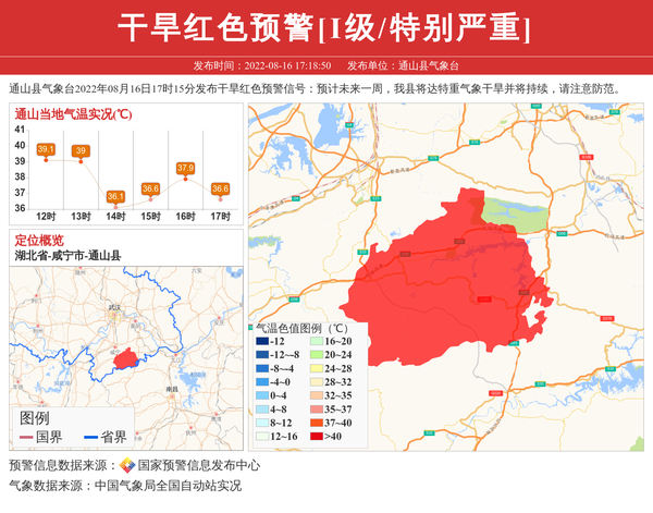 通山县气象台2022年08月16日17时15分发布干旱红色预警信号:预计未来一周,我县将达特重气象干旱并将持续,请注意防范。 信息来源:国家预警信息发布中心; 发布单位:通山县气象台。