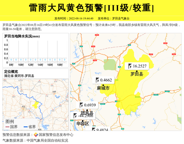 罗田县气象台2022年08月16日19时41分发布雷雨大风黄色预警信号:预计未来6小时,我县南部乡镇有雷雨大风天气,阵风7到9级,雨量30-50毫米,请注意防范。 信息来源:国家预警信息发布中心; 发布单位:罗田县气象台。