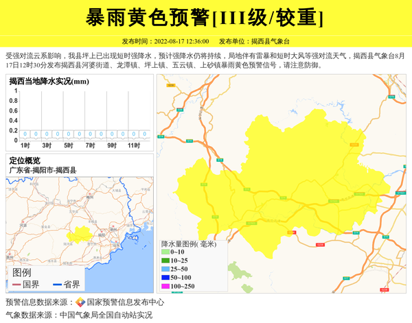 受强对流云系影响,我县坪上已出现短时强降水,预计强降水仍将持续,局地伴有雷暴和短时大风等强对流天气,揭西县气象台8月17日12时30分发布揭西县河婆街道、龙潭镇、坪上镇、五云镇、上砂镇暴雨黄色预警信号,请注意防御。 信息来源:国家预警信息发布中心; 发布单位:揭西县气象台。
