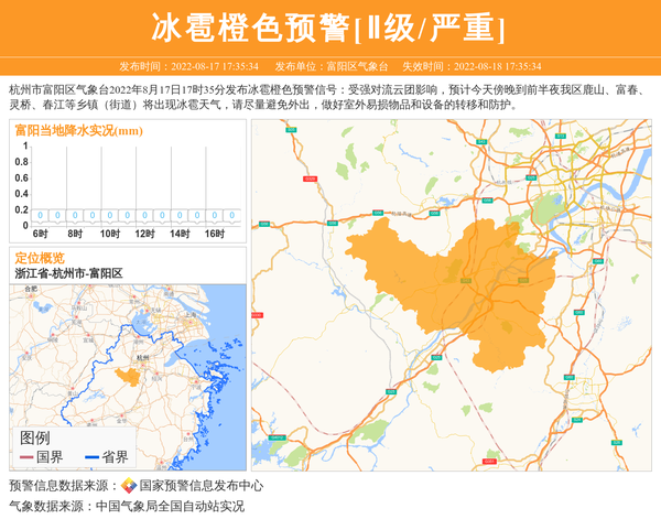 杭州市富阳区气象台2022年8月17日17时35分发布冰雹橙色预警信号:受强对流云团影响,预计今天傍晚到前半夜我区鹿山、富春、灵桥、春江等乡镇(街道)将出现冰雹天气,请尽量避免外出,做好室外易损物品和设备的转移和防护。 信息来源:国家预警信息发布中心; 发布单位:富阳区气象台。