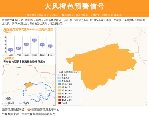 茫崖市气象台8月17日21时30分发布大风橙色预警信号:预计17日21时30分至18日03时30分花土沟镇、茫崖镇、冷湖镇将出现9级以上大风,阵风10级以上,并伴有沙尘天气,请注意防范。 信息来源:国家预警信息发布中心; 发布单位:茫崖市气象局。
