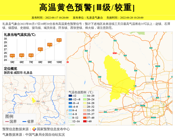 礼泉县气象台2022年08月17日10时20分发布高温黄色预警信号:预计下述地区未来连续三天日最高气温将在35℃以上:赵镇、石潭镇、烟霞镇、史德镇、骏马镇、城关街道、阡东镇、西张堡镇、烽火镇,请注意防范。 信息来源:国家预警信息发布中心; 发布单位:礼泉县气象台。