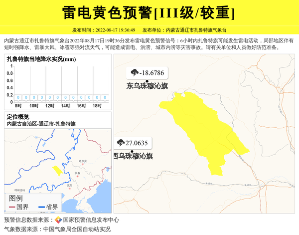 内蒙古通辽市扎鲁特旗气象台2022年08月17日19时36分发布雷电黄色预警信号:6小时内扎鲁特旗可能发生雷电活动,局部地区伴有短时强降水、雷暴大风、冰雹等强对流天气,可能造成雷电、洪涝、城市内涝等灾害事故。请有关单位和人员做好防范准备。 信息来源:国家预警信息发布中心; 发布单位:内蒙古通辽市扎鲁特旗气象台。