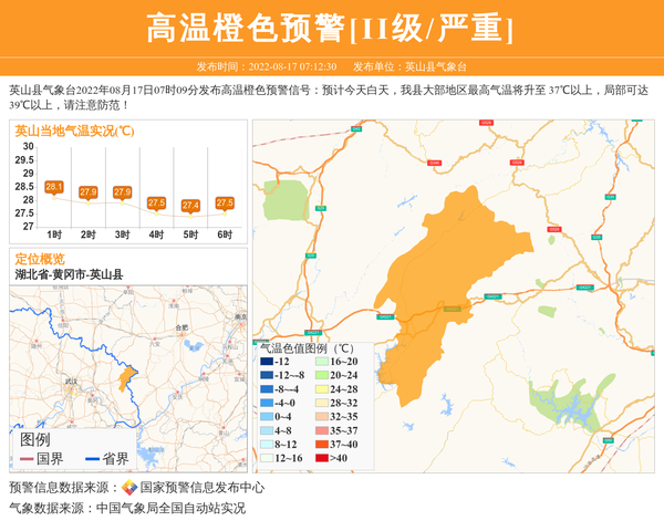 英山县气象台2022年08月17日07时09分发布高温橙色预警信号:预计今天白天,我县大部地区最高气温将升至 37℃以上,局部可达 39℃以上,请注意防范! 信息来源:国家预警信息发布中心; 发布单位:英山县气象台。