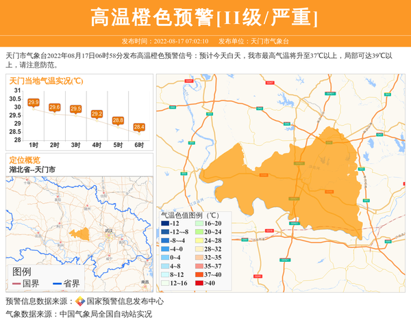 天门市气象台2022年08月17日06时58分发布高温橙色预警信号:预计今天白天,我市最高气温将升至37℃以上,局部可达39℃以上,请注意防范。 信息来源:国家预警信息发布中心; 发布单位:天门市气象台。