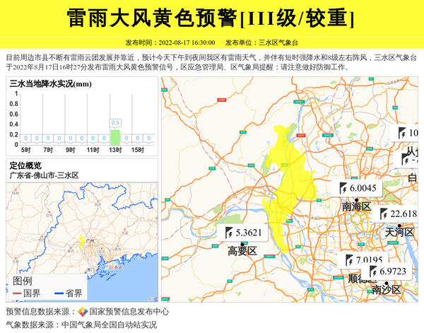 目前周边市县不断有雷雨云团发展并靠近,预计今天下午到夜间我区有雷雨天气,并伴有短时强降水和8级左右阵风,三水区气象台于2022年8月17日16时27分发布雷雨大风黄色预警信号,区应急管理局、区气象局提醒:请注意做好防御工作。 信息来源:国家预警信息发布中心; 发布单位:三水区气象台。