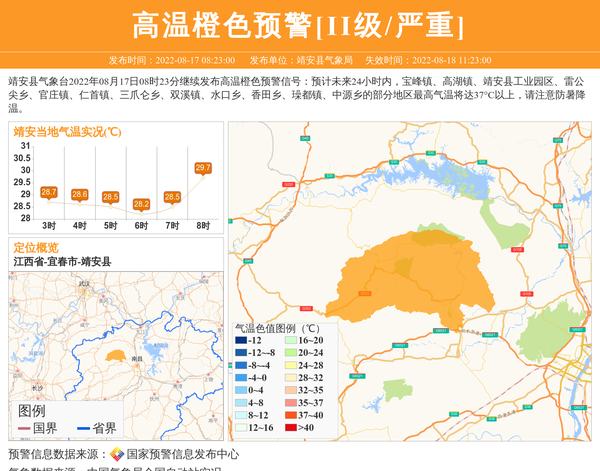 靖安县气象台2022年08月17日08时23分继续发布高温橙色预警信号:预计未来24小时内,宝峰镇、高湖镇、靖安县工业园区、雷公尖乡、官庄镇、仁首镇、三爪仑乡、双溪镇、水口乡、香田乡、璪都镇、中源乡的部分地区最高气温将达37°C以上,请注意防暑降温。 信息来源:国家预警信息发布中心; 发布单位:靖安县气象局。