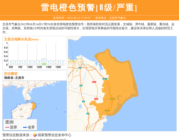 文昌市气象台发布雷电橙色预警[Ⅱ级/严重] 相关文章