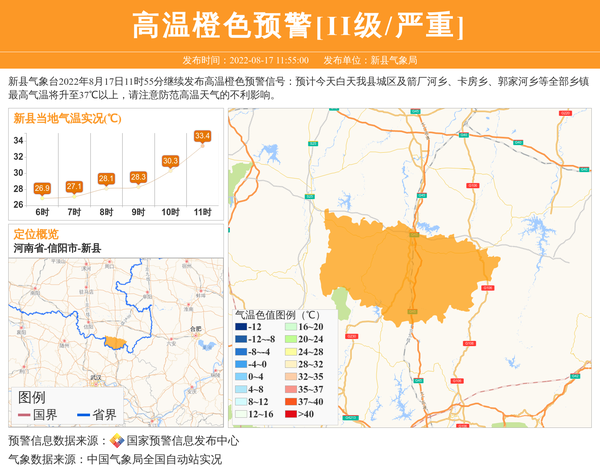 新县气象台2022年8月17日11时55分继续发布高温橙色预警信号:预计今天白天我县城区及箭厂河乡、卡房乡、郭家河乡等全部乡镇最高气温将升至37℃以上,请注意防范高温天气的不利影响。 信息来源:国家预警信息发布中心; 发布单位:新县气象局。