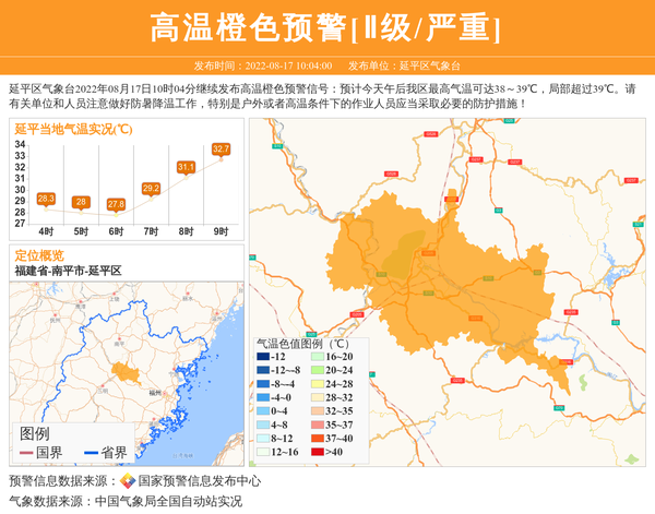 延平区气象台2022年08月17日10时04分继续发布高温橙色预警信号:预计今天午后我区最高气温可达38~39℃,局部超过39℃。请有关单位和人员注意做好防暑降温工作,特别是户外或者高温条件下的作业人员应当采取必要的防护措施! 信息来源:国家预警信息发布中心; 发布单位:延平区气象台。
