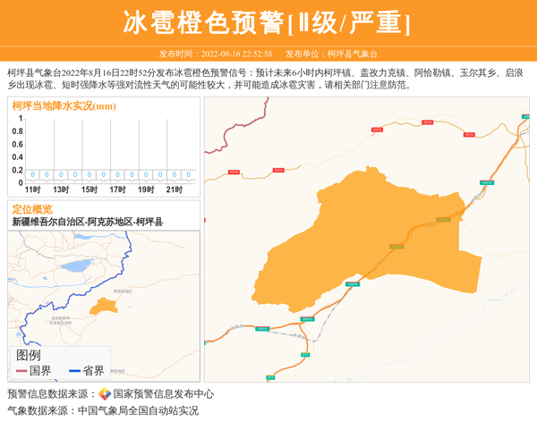 柯坪县气象台2022年8月16日22时52分发布冰雹橙色预警信号:预计未来6小时内柯坪镇、盖孜力克镇、阿恰勒镇、玉尔其乡、启浪乡出现冰雹、短时强降水等强对流性天气的可能性较大,并可能造成冰雹灾害,请相关部门注意防范。 信息来源:国家预警信息发布中心; 发布单位:柯坪县气象台。