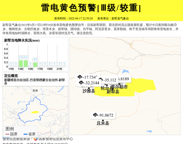 尉犁县气象台2022年8月17日22时50分发布雷电黄色预警信号:目前尉犁西部、西北部对流云团发展旺盛,预计今日夜间喀尔曲尕乡、墩阔坦乡、古勒巴格乡、塔里木乡、尉犁镇、团结镇、兴平镇、阿克苏普乡、英库勒镇、铁干里克镇等局部将有雷电发生,并伴有局地短时强降水、雷雨大风、冰雹等强对流天气。请注意防范。 信息来源:国家预警信息发布中心; 发布单位:尉犁县气象台。
