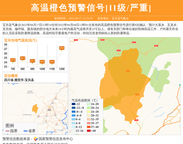 宝兴县气象台2022年08月17日12时18分对2022年08月08日12时01分发布的高温橙色预警信号进行第9次确认:预计大溪乡、五龙乡、灵关镇、穆坪镇、陇东镇的部分地方未来24小时内最高气温将升至35℃以上。请有关部门和单位做好防御高温工作,户外露天作业的人员应采取防暑降温措施,高温时段尽量避免户外活动,特别注意老弱病幼人群的防暑降温。 信息来源:国家预警信息发布中心; 发布单位:宝兴县气象台。