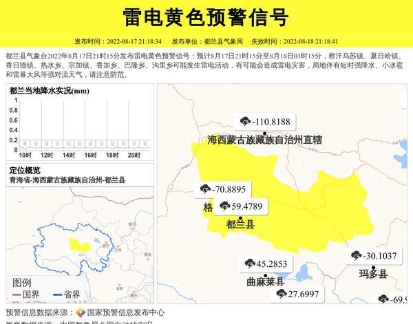都兰县气象台2022年8月17日21时15分发布雷电黄色预警信号:预计8月17日21时15分至8月18日03时15分,察汗乌苏镇、夏日哈镇、香日德镇、热水乡、宗加镇、香加乡、巴隆乡、沟里乡可能发生雷电活动,有可能会造成雷电灾害,局地伴有短时强降水、小冰雹和雷暴大风等强对流天气,请注意防范。 信息来源:国家预警信息发布中心; 发布单位:都兰县气象局。