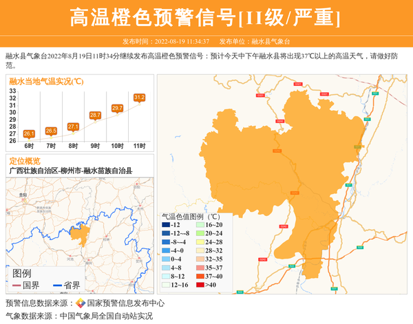 融水县气象台2022年8月19日11时34分继续发布高温橙色预警信号:预计今天中下午融水县将出现37℃以上的高温天气,请做好防范。 信息来源:国家预警信息发布中心; 发布单位:融水县气象台。