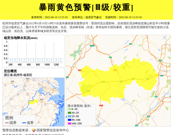杭州市临安区气象台2022年8月18日13时53分发布暴雨黄色预警信号:受强对流云团影响,目前我区清凉峰镇龙塘山村近半小时雨量已达20毫米以上,预计今天下午到傍晚龙岗、岛石、清凉峰等镇(街道)将有短时大雨到暴雨,请注意防范强降雨可能引发的小流域山洪、泥石流、山体滑坡和城乡积涝等次生灾害。 信息来源:国家预警信息发布中心; 发布单位:临安区气象台。