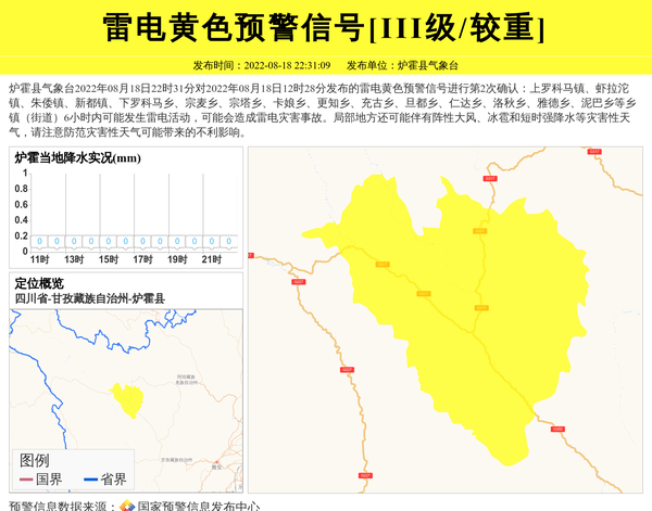 炉霍县气象台2022年08月18日22时31分对2022年08月18日12时28分发布的雷电黄色预警信号进行第2次确认:上罗科马镇、虾拉沱镇、朱倭镇、新都镇、下罗科马乡、宗麦乡、宗塔乡、卡娘乡、更知乡、充古乡、旦都乡、仁达乡、洛秋乡、雅德乡、泥巴乡等乡镇(街道)6小时内可能发生雷电活动,可能会造成雷电灾害事故。局部地方还可能伴有阵性大风、冰雹和短时强降水等灾害性天气,请注意防范灾害性天气可能带来的不利影响。 信息来源:国家预警信息发布中心; 发布单位:炉霍县气象台。