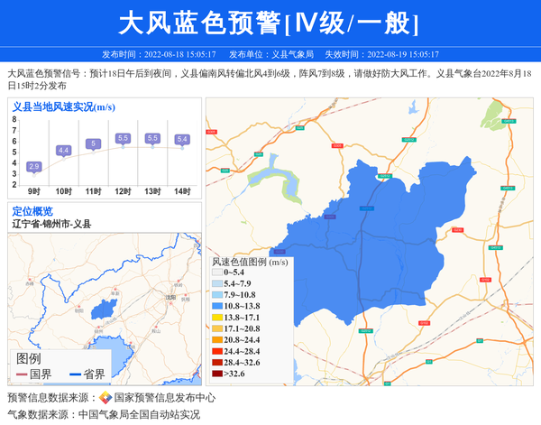 大风蓝色预警信号:预计18日午后到夜间,义县偏南风转偏北风4到6级,阵风7到8级,请做好防大风工作。义县气象台2022年8月18日15时2分发布 信息来源:国家预警信息发布中心; 发布单位:义县气象局。