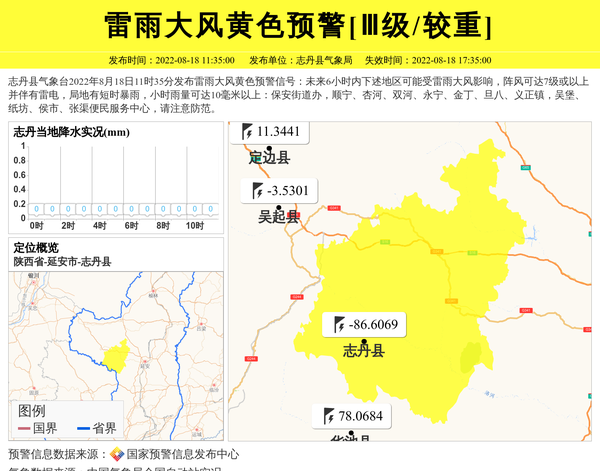 志丹县气象台2022年8月18日11时35分发布雷雨大风黄色预警信号:未来6小时内下述地区可能受雷雨大风影响,阵风可达7级或以上并伴有雷电,局地有短时暴雨,小时雨量可达10毫米以上:保安街道办,顺宁、杏河、双河、永宁、金丁、旦八、义正镇,吴堡、纸坊、侯市、张渠便民服务中心,请注意防范。 信息来源:国家预警信息发布中心; 发布单位:志丹县气象局。