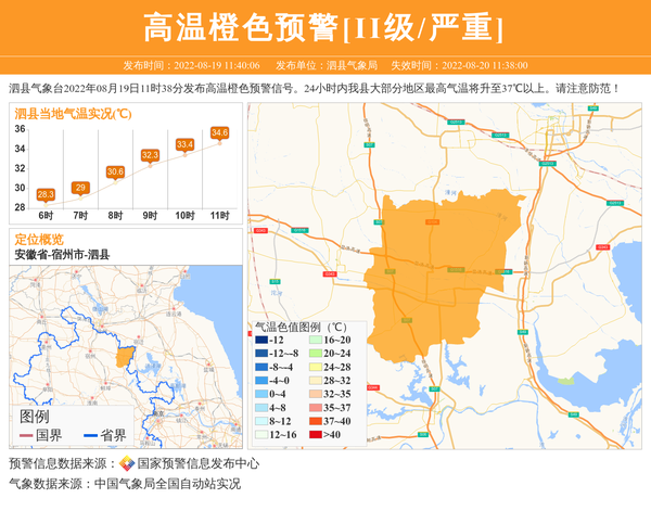 泗县气象台2022年08月19日11时38分发布高温橙色预警信号。24小时内我县大部分地区最高气温将升至37℃以上。请注意防范! 信息来源:国家预警信息发布中心; 发布单位:泗县气象局。