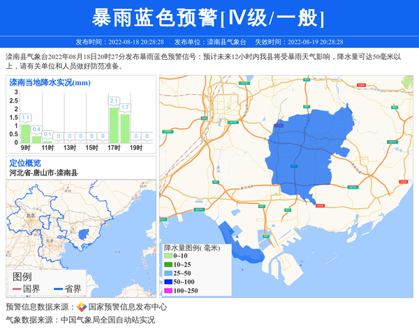 滦南县气象台2022年08月18日20时27分发布暴雨蓝色预警信号:预计未来12小时内我县将受暴雨天气影响,降水量可达50毫米以上,请有关单位和人员做好防范准备。 信息来源:国家预警信息发布中心; 发布单位:滦南县气象台。