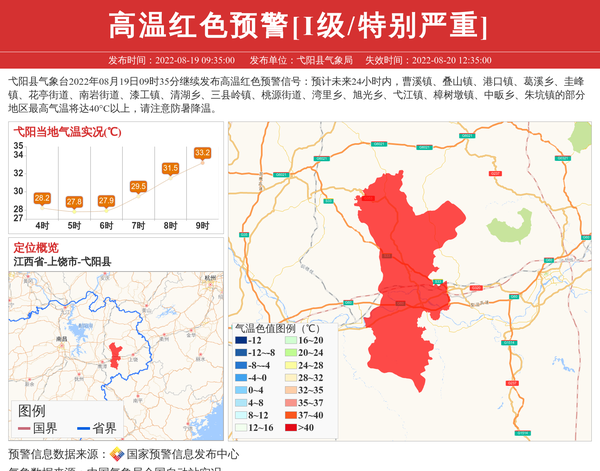 弋阳县气象台2022年08月19日09时35分继续发布高温红色预警信号:预计未来24小时内,曹溪镇、叠山镇、港口镇、葛溪乡、圭峰镇、花亭街道、南岩街道、漆工镇、清湖乡、三县岭镇、桃源街道、湾里乡、旭光乡、弋江镇、樟树墩镇、中畈乡、朱坑镇的部分地区最高气温将达40°C以上,请注意防暑降温。 信息来源:国家预警信息发布中心; 发布单位:弋阳县气象局。