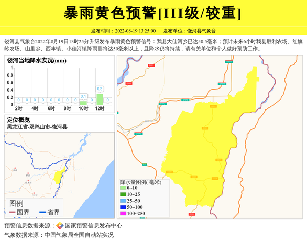 饶河县气象台2022年8月19日13时25分升级发布暴雨黄色预警信号:我县大佳河乡已达50.5毫米;预计未来6小时我县胜利农场、红旗岭农场、山里乡、西丰镇、小佳河镇降雨量将达50毫米以上,且降水仍将持续,请有关单位和个人做好预防工作。 信息来源:国家预警信息发布中心; 发布单位:饶河县气象台。