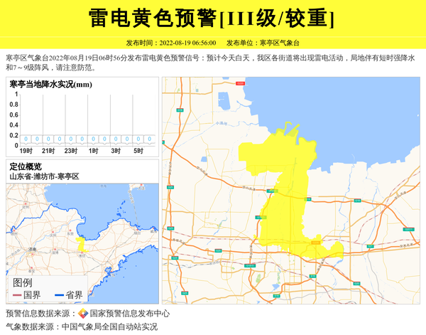 寒亭区气象台2022年08月19日06时56分发布雷电黄色预警信号:预计今天白天,我区各街道将出现雷电活动,局地伴有短时强降水和7~9级阵风,请注意防范。 信息来源:国家预警信息发布中心; 发布单位:寒亭区气象台。