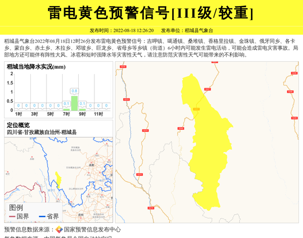 稻城县气象台2022年08月18日12时26分发布雷电黄色预警信号:吉呷镇、噶通镇、桑堆镇、香格里拉镇、金珠镇、俄牙同乡、各卡乡、蒙自乡、赤土乡、木拉乡、邓坡乡、巨龙乡、省母乡等乡镇(街道)6小时内可能发生雷电活动,可能会造成雷电灾害事故。局部地方还可能伴有阵性大风、冰雹和短时强降水等灾害性天气,请注意防范灾害性天气可能带来的不利影响。 信息来源:国家预警信息发布中心; 发布单位:稻城县气象台。
