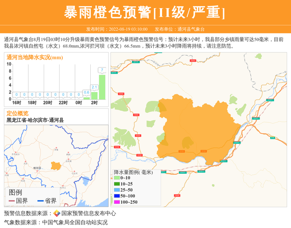 通河县气象台8月19日03时10分升级暴雨黄色预警信号为暴雨橙色预警信号:预计未来3小时,我县部分乡镇雨量可达50毫米,目前我县浓河镇自然屯(水文)68.0mm,浓河拦河坝(水文)66.5mm,预计未来3小时降雨将持续,请注意防范。 信息来源:国家预警信息发布中心; 发布单位:通河县气象台。