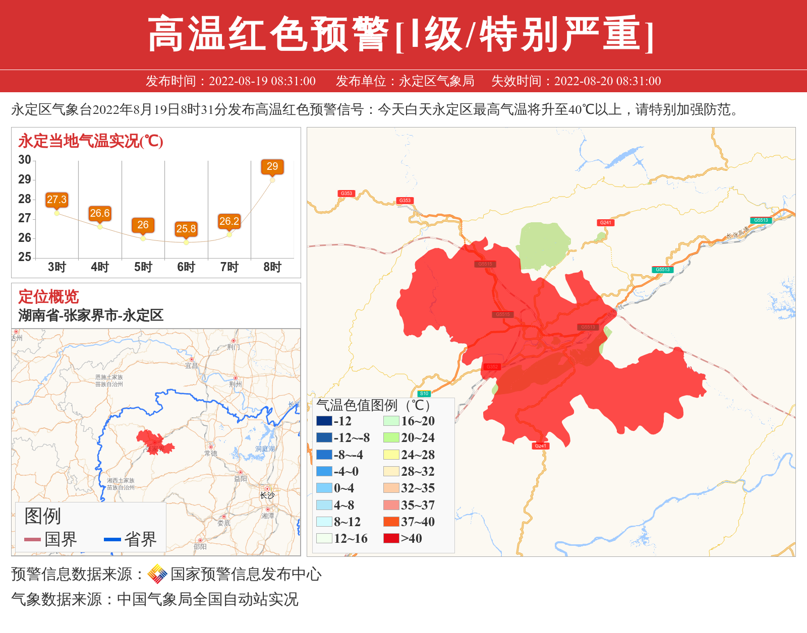 永定区气象台2022年8月19日8时31分发布高温红色预警信号:今天白天永定区最高气温将升至40℃以上,请特别加强防范。 信息来源:国家预警信息发布中心; 发布单位:永定区气象局。