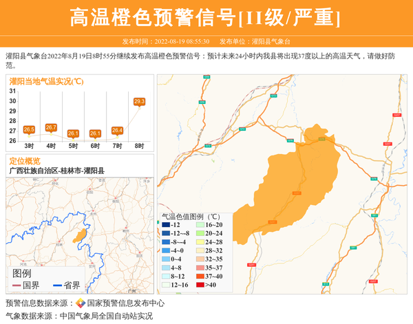 灌阳县气象台2022年8月19日8时55分继续发布高温橙色预警信号:预计未来24小时内我县将出现37度以上的高温天气,请做好防范。 信息来源:国家预警信息发布中心; 发布单位:灌阳县气象台。