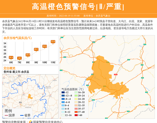 余庆县气象台2022年08月19日11时55分继续发布高温橙色预警信号:预计未来24小时我县子营街道、大乌江、白泥、龙家、龙溪等乡镇最高气温将升至37℃以上,请有关部门和单位按照职责落实防暑降温保障措施;尽量避免在高温时段进行户外活动,高温条件下作业的人员应当缩短连续工作时间;有关部门和单位应当注意防范因用电量过高,以及电线、变压器等电力负载过大而引发的火灾。 信息来源:国家预警信息发布中心; 发布单位:余庆县气象台。
