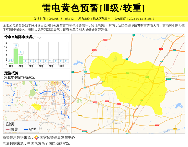 徐水区气象台2022年08月18日12时31分发布雷电黄色预警信号:预计未来6小时内,我区全部乡镇将有雷阵雨天气,雷雨时个别乡镇伴有短时强降水、短时大风等强对流天气,请有关单位和人员做好防范准备。 信息来源:国家预警信息发布中心; 发布单位:徐水区气象台。