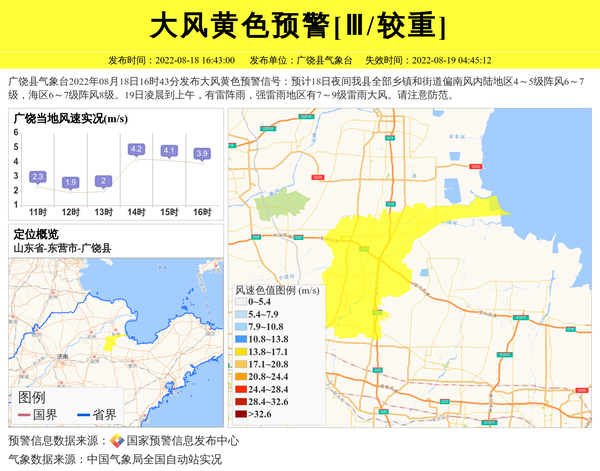 广饶县气象台2022年08月18日16时43分发布大风黄色预警信号:预计18日夜间我县全部乡镇和街道偏南风内陆地区4~5级阵风6~7级,海区6~7级阵风8级。19日凌晨到上午,有雷阵雨,强雷雨地区有7~9级雷雨大风。请注意防范。 信息来源:国家预警信息发布中心; 发布单位:广饶县气象台。