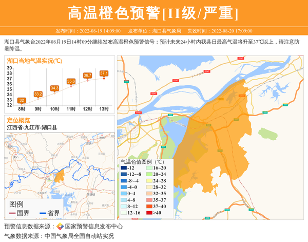 湖口县气象台2022年08月19日14时09分继续发布高温橙色预警信号:预计未来24小时内我县日最高气温将升至37℃以上,请注意防暑降温。 信息来源:国家预警信息发布中心; 发布单位:湖口县气象局。