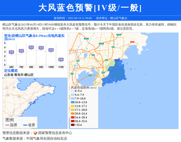 崂山区气象台2022年08月19日11时50分继续发布大风蓝色预警信号:预计今天下午我区各街道南风转北风,风力有所减弱,傍晚到明天白天北风风力逐渐增大,陆地可达4~5级阵风6~7级,近海海域6~7级阵风8级。请注意防范。 信息来源:国家预警信息发布中心; 发布单位:崂山区气象台。