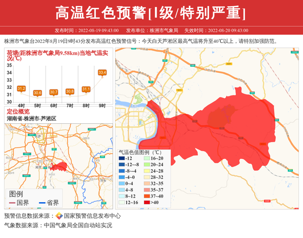 株洲市气象台2022年8月19日9时43分发布高温红色预警信号:今天白天芦淞区最高气温将升至40℃以上,请特别加强防范。 信息来源:国家预警信息发布中心; 发布单位:株洲市气象局。